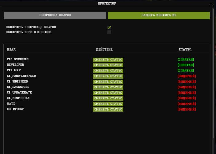 hud_draw - квар отвечающий за показ худа (хп, броня, деньги, таймер, серверная часть, и т.д) на экране (1 - отображать, 0 - не отображать) cl_weather - квар отвечающий за показ эффектов погоды (1 - включить, 0 - выключить) cl_himodels - квар отвечающий за включение моделей игроков высокого качества (1 - включить, 0 выключить) r_detailtextures - квар отвечающий за включение HD текстур карты (если автор карты их добавил) (1 - включить, 0 - выключить) r_drawviewmodel - квар отвечающий за показ оружия (1 - включить, 0 выключить) r_drawentities - квар отвечающий за показ энтинити карты (1 - включить, 0 выключить) gl_fog - квар отвечающий за показ тумана на горизонте (1 - включить, 0 - выключить)